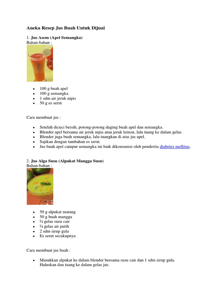 5 sendok makan susu kental manis putih. Jus buah apel campur semangka ini baik dikonsumsi oleh penderitadiabetes mellitus. Pagi Bundaku saat ini anda bisa memasak resep Jus Buah ala Jus jualan di pinggir jalan dengan 4 bahan dan 4 tahapan.