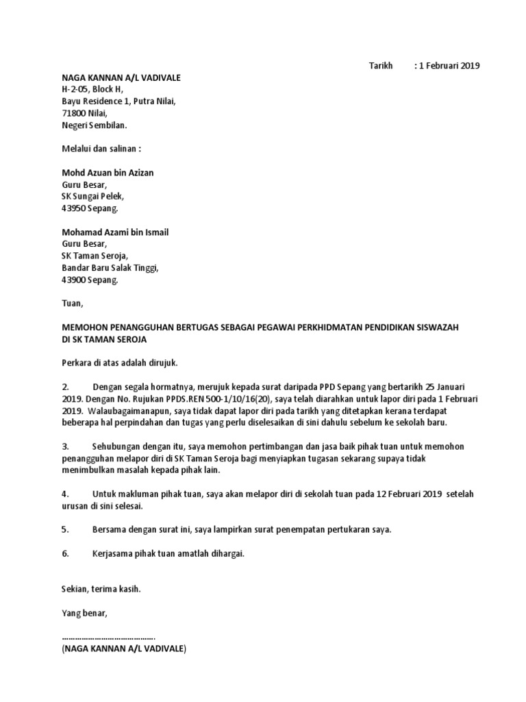 The Basil Satryo Contoh Surat Penangguhan Bertugas Ditempat Baru Surat Rasmi Rayuan Masuk Sekolah Terengganu N 8 4 Alamat Penuh Tempat Bertugas